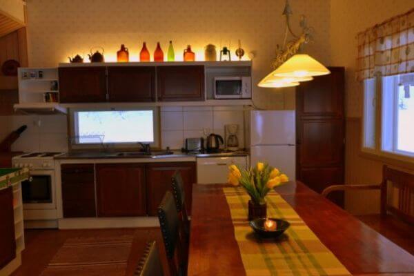 Hyvin varusteltu keittiö: astianpesukone, mikroaaltouuni, isot kattilat ja uunivuoat